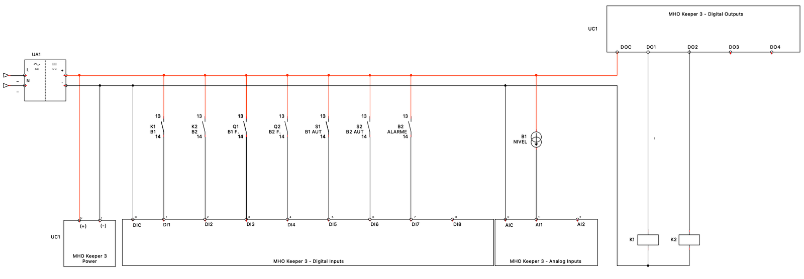 Este artigo é fornecido apenas para fins informativos e educacionais para utilização do MHO Keeper e MHO Cloud. A implementação de qualquer sistema elétrico ou automação deve ser realizada por profissionais qualificados. É de responsabilidade exclusiva do implementador garantir que todas as normas técnicas, regulamentos locais, legislações aplicáveis e diretrizes de segurança sejam rigorosamente seguidas. Demais circuitos como proteções, fusíveis, chaves, intertravamentos e outros devem ser implementados conforme a necessidade da aplicação e de acordo com leis e normas da aplicação específica.