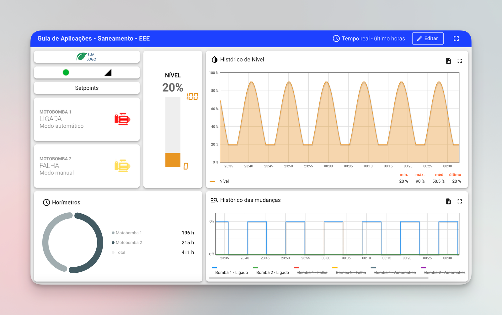 Os dados são obtidos em tempo real. O status da motobomba e chaves são obtidos na variação de borda do sinal da DI. O status de nível é coletado a cada 2 minutos. O status de horímetro é coletado a cada 15 minutos.