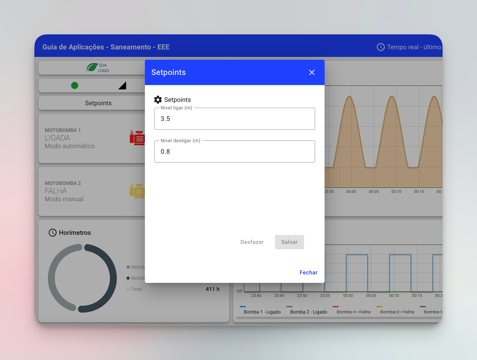 - Alarmes de Falhas: Alertas em caso de falha de bombas, níveis anormais de efluente ou outros eventos críticos;