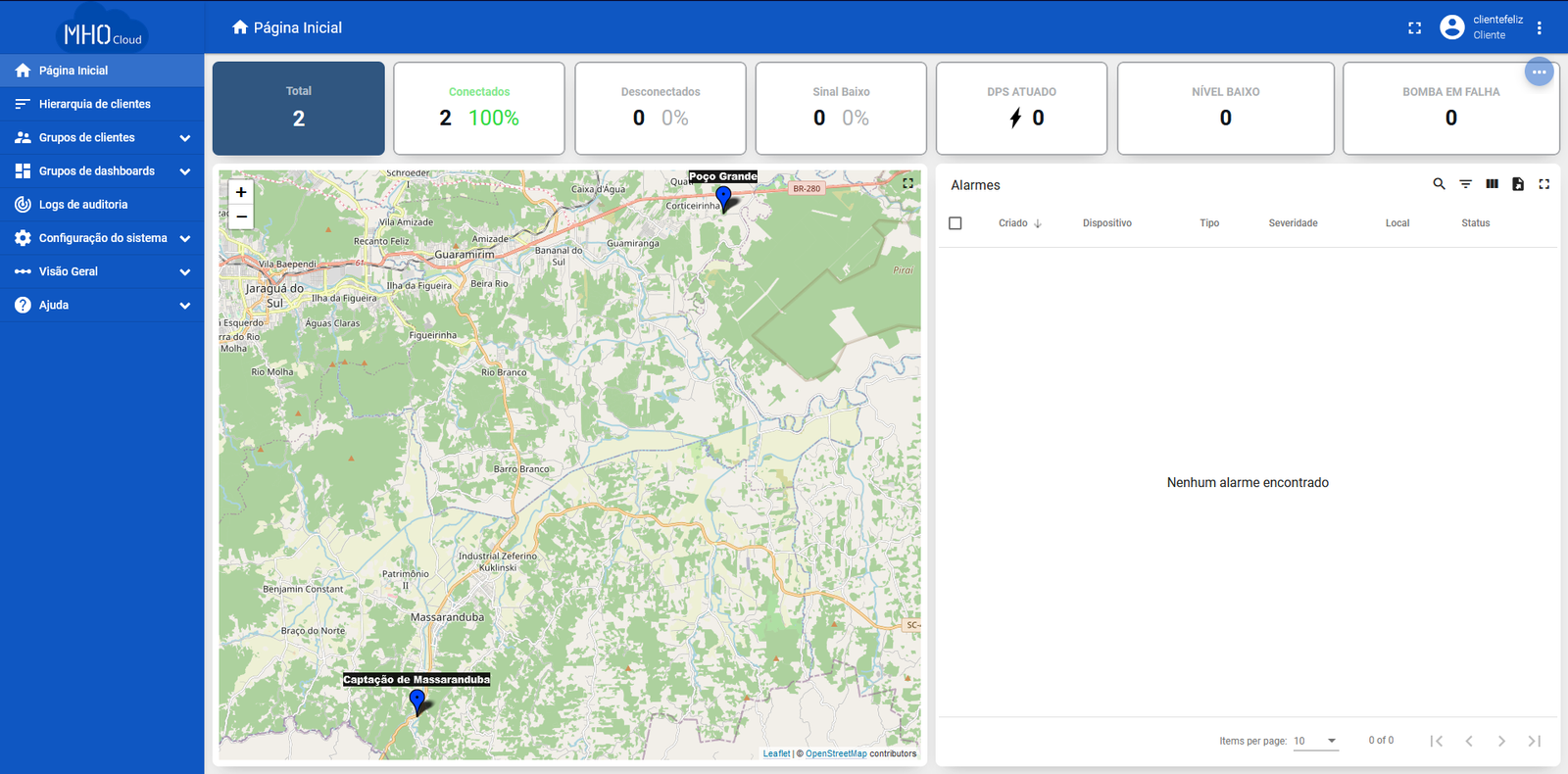 Após efetuar o login no sistema o usuário conta com um menu principal e uma tela inicial. Essa tela inicial pode ser configurada para ser qualquer dashboard do sistema.