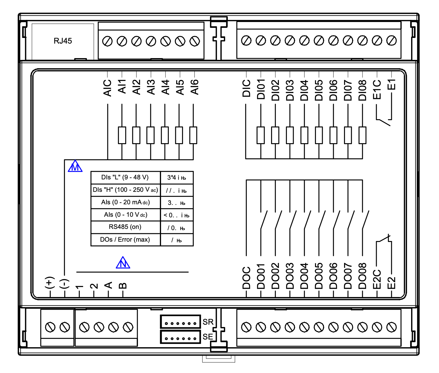 O primeiro ponto a se observar é que existe uma conexão interna entre o comum das entradas analógicas "AIC" e o terminal de alimentação negativo "(-)". Se atentar a esse ponto quando mais de uma fonte CC estiver sendo utilizada na aplicação, pois o equipamento irá conectar o comum dessas fontes. Do ponto de vista prático isso não traz nenhuma influencia negativa se todas as ligações externas estiverem corretas porém pode trazer alguma incompatibilidade caso o sistema não permita referenciar as fontes de alimentação.