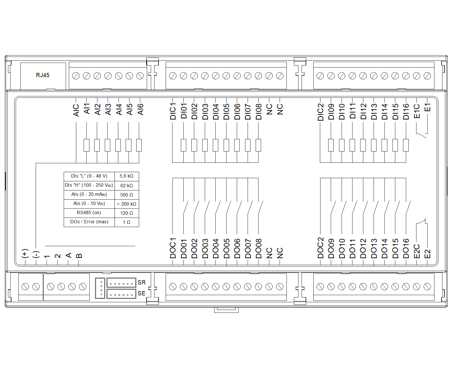 O primeiro ponto a se observar é que existe uma conexão interna entre o comum das entradas analógicas "AIC" e o terminal de alimentação negativo "(-)". Se atentar a esse ponto quando mais de uma fonte CC estiver sendo utilizada na aplicação, pois o equipamento irá conectar o comum dessas fontes. Do ponto de vista prático isso não traz nenhuma influencia negativa se todas as ligações externas estiverem corretas porém pode trazer alguma incompatibilidade caso o sistema não permita referenciar as fontes de alimentação.