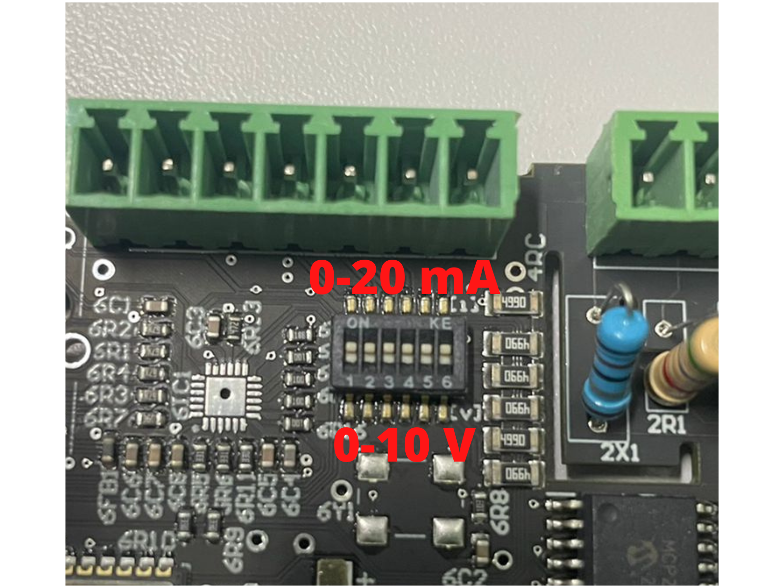 - A posição "on" é 0-20 mA, já a outra posição é 0-10 V.